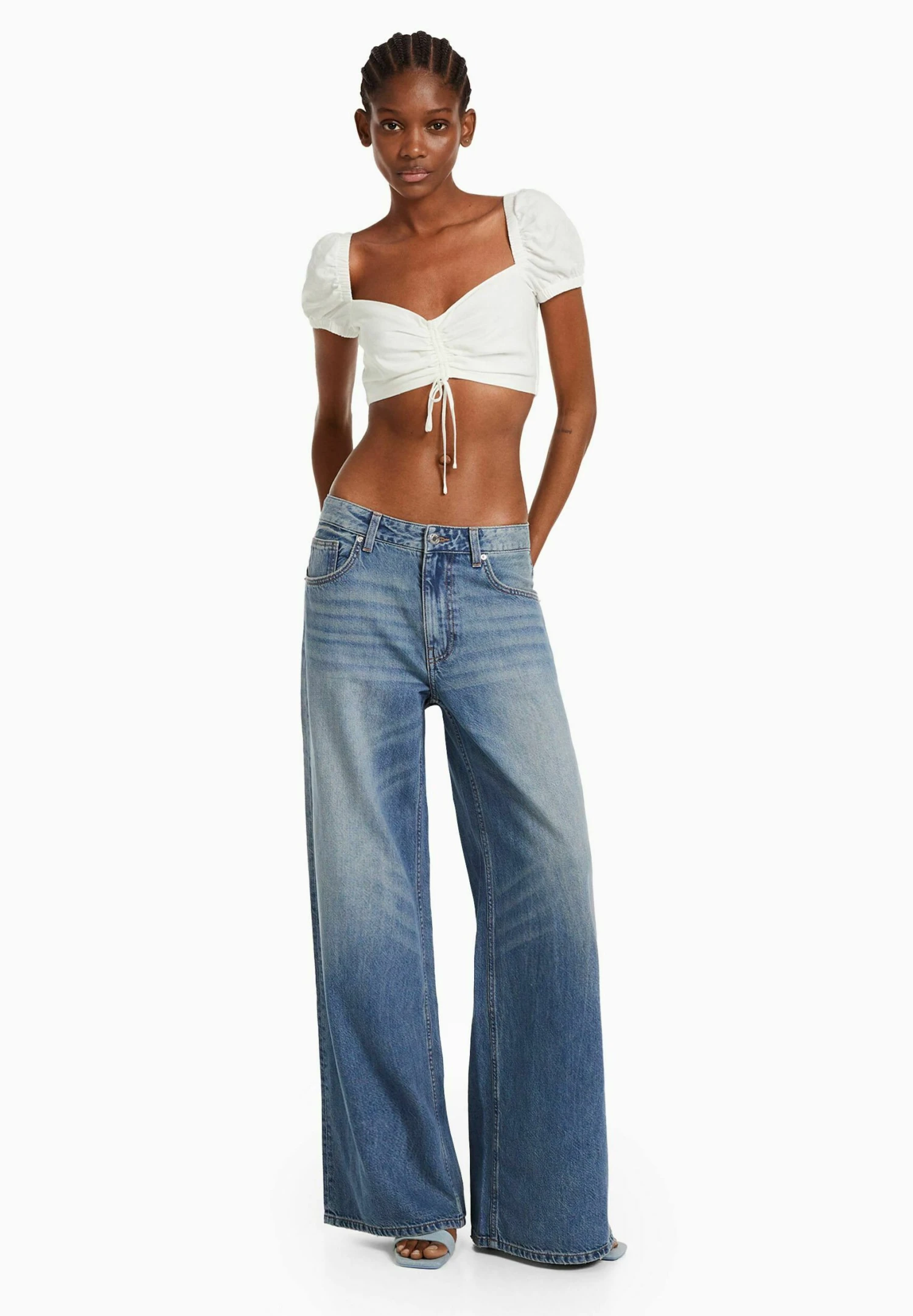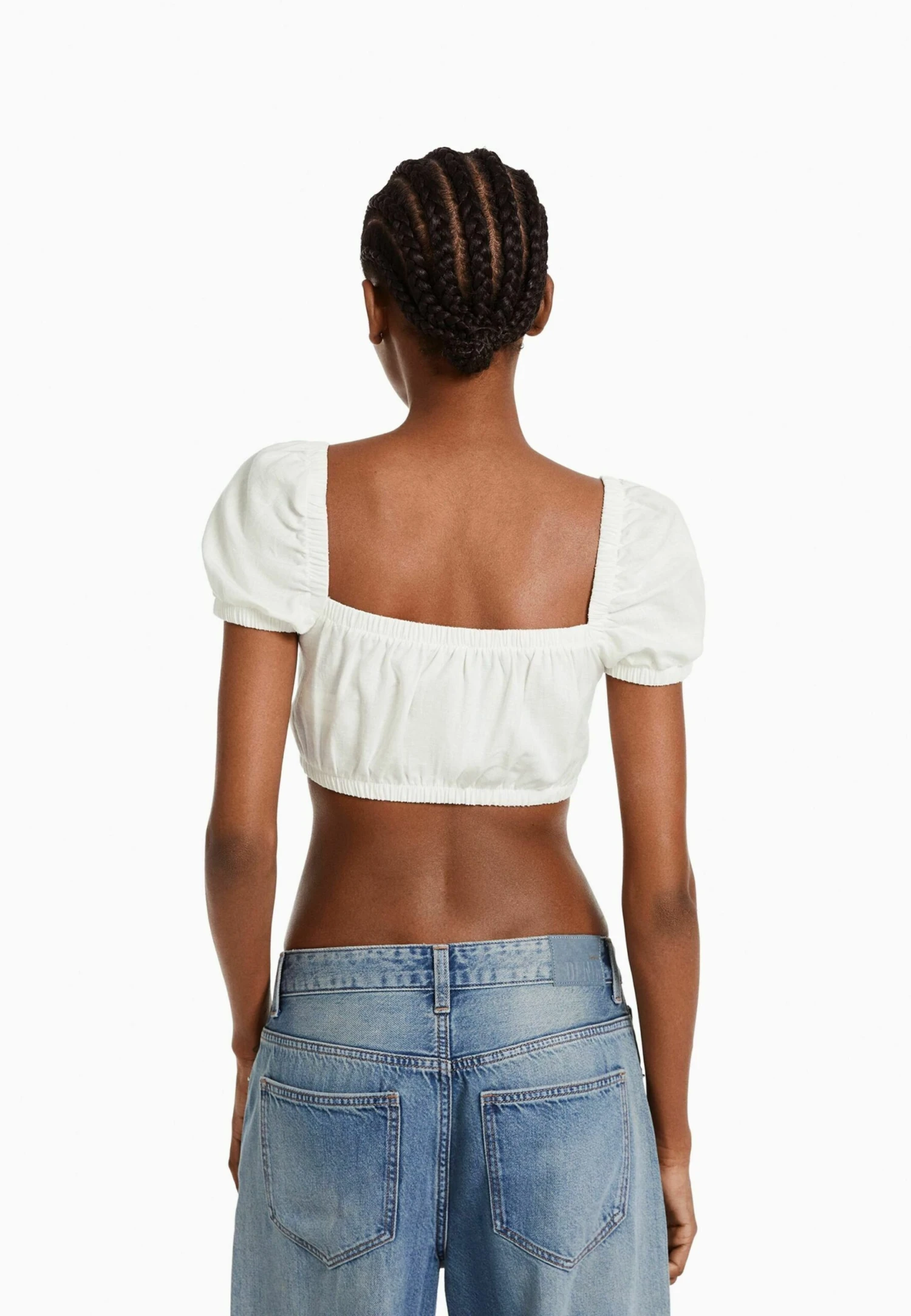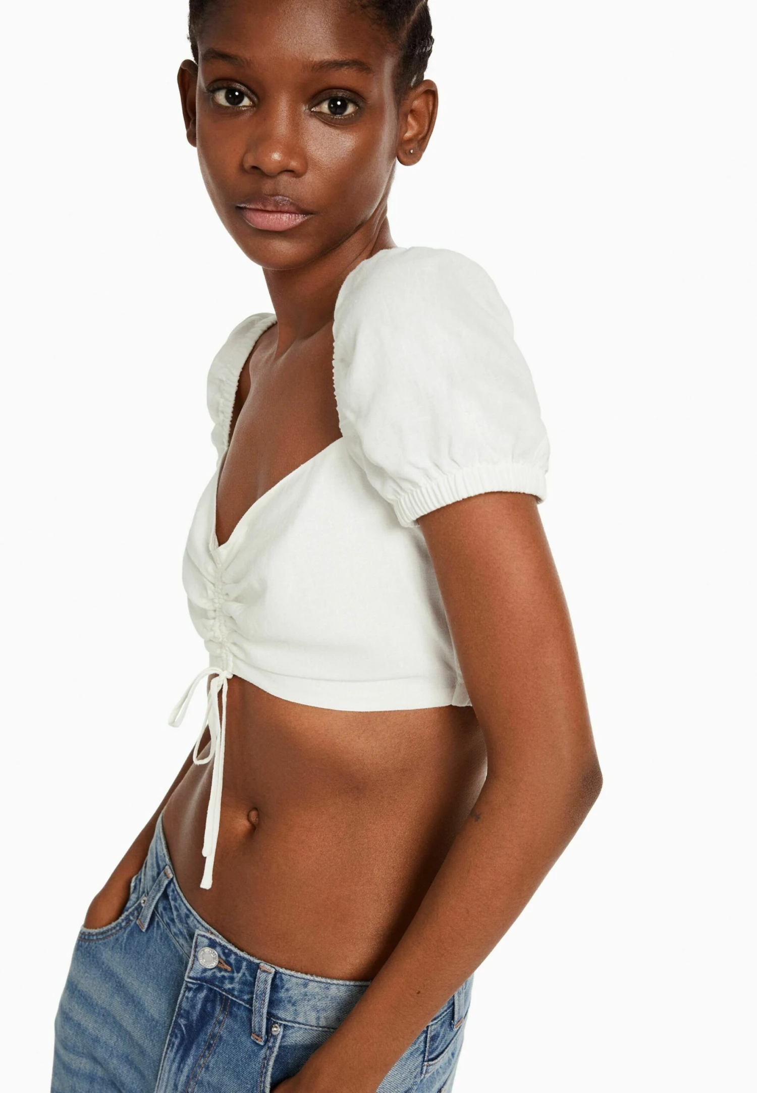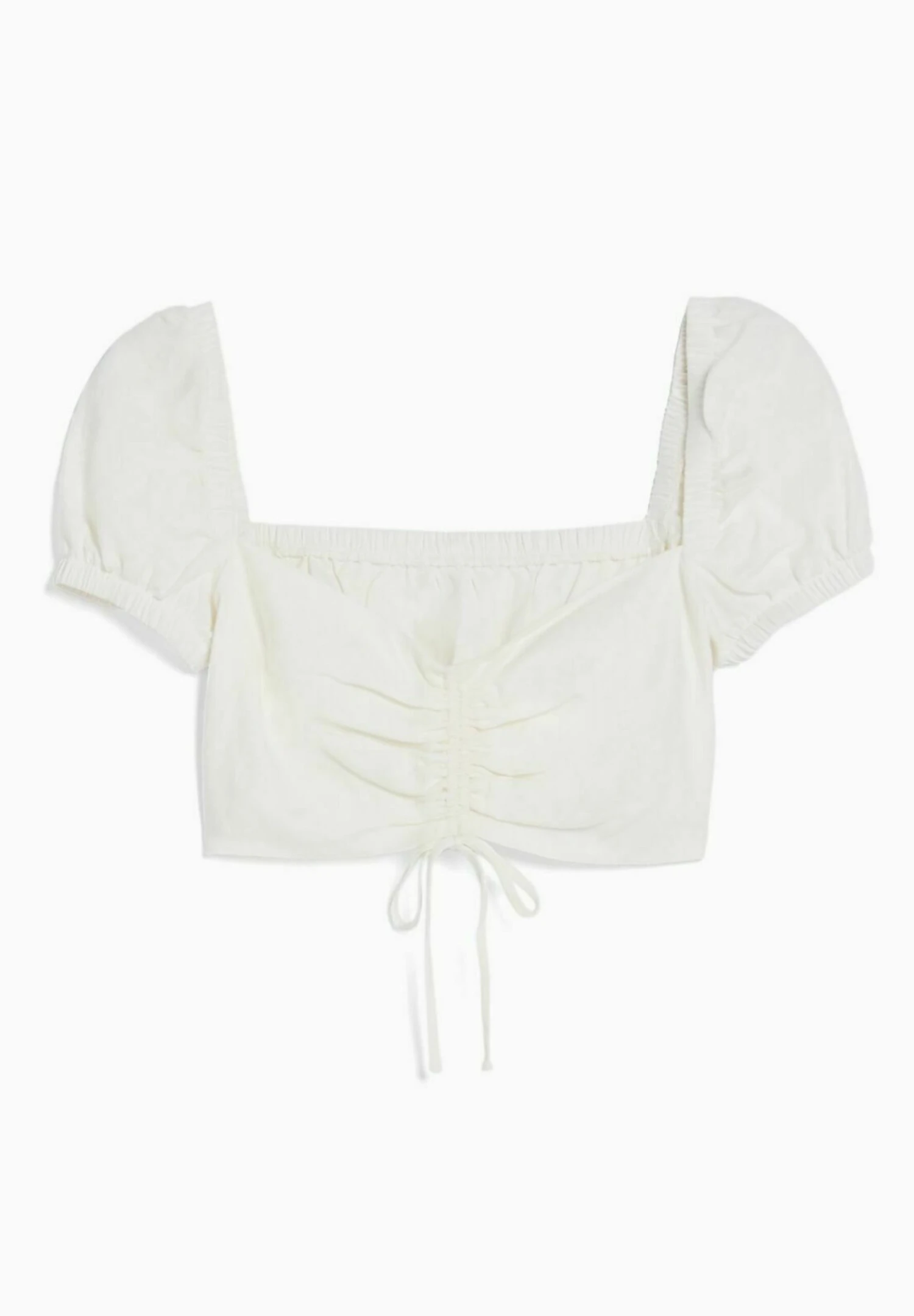 BERSHKA SHORT SLEEVE WITH GATHERED DETAIL-CROP – Bluzka – White